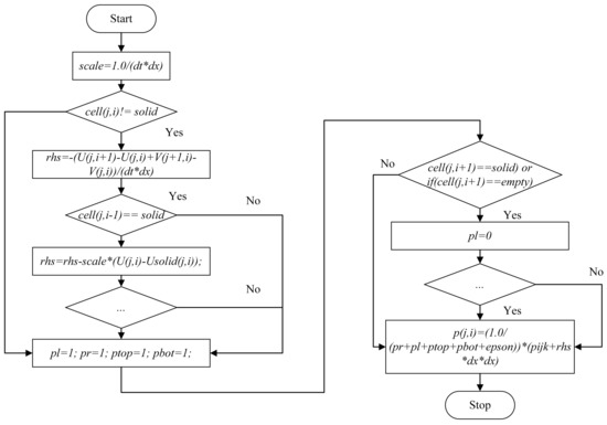 The boundary condition could be set during the projection step as shown in Equation (7). Taking 2D as example, if grid (i,j) is fluid, while the neighbouring grid might be solid. In this case, the pressure projection could be discrete as