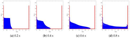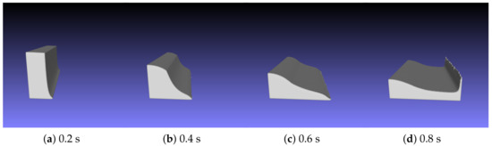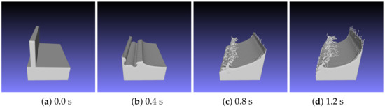 Dam break is a benchmark problem for fluid simulation. The initial setting is as shown in Figure 8. The simulation is carried out in a square container with unit width and unit height. The initial water wall has a height of 0.5 and a width of 0.25. The water wall on the left starts to fall once the experiment launches. The water falls from the left to the right. The front rolls back when it hits the wall boundary on the right as shown in Figure 9d and Figure 10d. The simulation results for 0.2 s, 0.4 s,0.6 s and 0.8 s from the reference [17] are shown in Figure 9, and our simulation results of the same period can be seen in Figure 10. As shown in the two results, our simulation results are in good agreement with the result from reference.