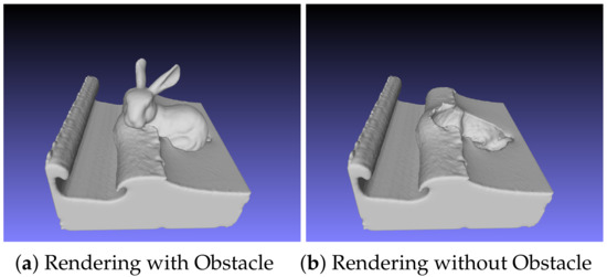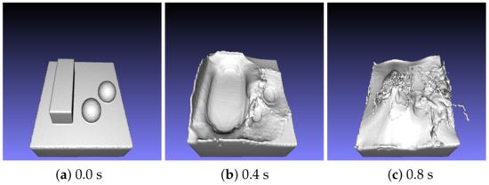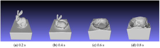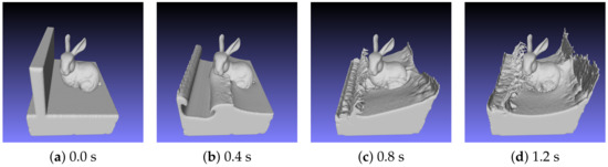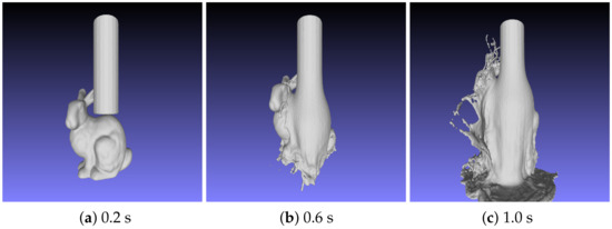As for the fluid and moving obstacle interaction, the handling method has been shown in Algorithm 2. Actually, this algorithm describes the method for processing static and moving obstacles. In the algorithm Usolid and Vsolid stand for the obstacle velocity in X and Y directions. Obviously, Usolid and Vsolid will be zero for static obstacle. This is a unit method for dealing with free surface, static and moving obstacle. As shown in Figure 17, it shows a bunny moving upward and interact with fluid flowing downward in frame 10, 30 and 50. The time step is 0.02 s. As shown in frame 10, the bunny starts contact with the fluid. When Bunny passes through a fluid column, the fluid flows around the bunny and almost completely envelops the bunny. In the water column, the bunny shape of the fluid is presented. At the same time, as Bunny moves upwards, the outline of bunny in the water column also moves upwards. All these phenomena reflect the effect of interaction between moving obstacle and fluid. It also explains the reliability of moving obstacle and fluid interaction method proposed in this paper.