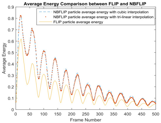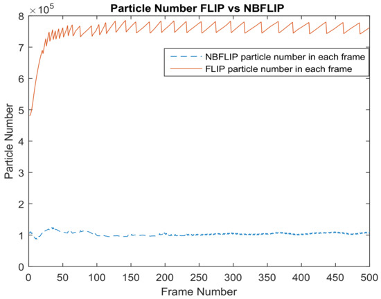 In this set of experiments, the system runs 500 frames for each experiment. With NBFLIP method, as can be seen from Figure 18, the total energy and total number of particles are 2.6692 × 10 and 51,872,474, respectively, so the average energy of particles is 0.51. With FLIP method, the total energy and total number of particles are 1.1016 × 10 and 376,245,524, respectively, resulting in the average energy of particles of 0.29. Besides, the total particle number with FLIP method is 7.25 times higher of that with NBFLIP method. In other words, the particle number with NBFLIP method is reduced by 86.2% compared with that with FLIP method. Meanwhile, it can be seen from Figure 19 that the NBFLIP method dissipates less than the FLIP method, which is consistent with the results of Ferstl [3] and Boyd [8]. In other words, NBFLIP method decreases energy dissipation.