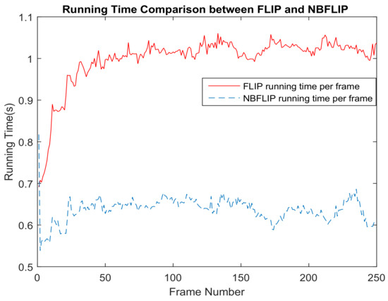 In this experiment, we take the first 250 frames result for the running time comparison. During the start-up phase (the first 5 frames) of NBFLIP, the running time per frame is longer than that of FLIP. After that, the running time per frame is significantly less than that of FLIP. It is analyzed that the whole scene needs to be entirely initialized, and the running time is gradually stabilized after the construction of Narrow Band, thus archiving a higher operational efficiency. As shown in Figure 22, particles need to be added into the grid, so the overall running time of each frame is high at the beginning with NBFLIP method, then the number of particles almost remains stable after that.