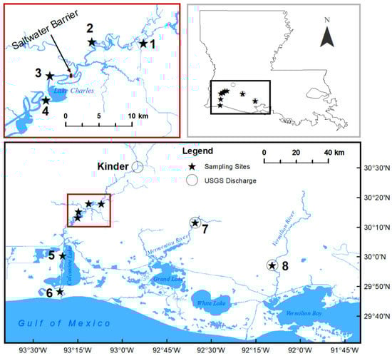 The climate of the study area is subtropical, characterized by long, hot, and humid summers and generally short, mild winters. During the sampling period from April 2014 to February 2016, the average monthly temperature ranged from 9.6 °C in January 2015 to 28.5 °C in August 2014, with a mean of 20.9 °C for the twenty-three-month study period (National Oceanic and Atmospheric Administration (NOAA) station: Calcasieu Pass, LA—Station ID: 8768094). Land use conditions are different among the three river basins. The Mermentau and Vermilion River Basins are dominated much more by agricultural land uses (67% and 61%, respectively) when compared with the Calcasieu River Basin (26%) [,,,]. The difference in land use dominance may have profound effects on nutrient input from the river basins.
