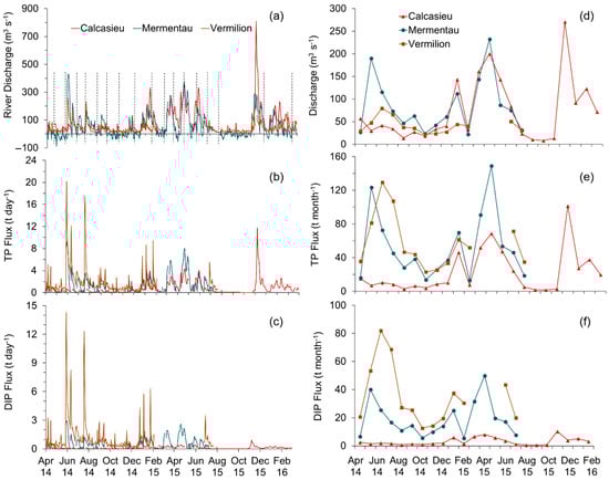 Daily (a–c) and monthly (d–f) discharge and mass fluxes of TP and DIP in the Calcasieu (Site 1), Mermentau, and Vermilion Rivers from April 2014 to February 2016; discharge data at sites 1, 7, and 8 were used to represent the three rivers; Discharge at site 1 was calculated using discharge data at Kinder (USGS 08015500). Discharges at sites 7 and 8 were downloaded from USGS gage stations (USGS 08012150 and USGS 07386980); dashed lines in (a) mark the sampling dates; phosphorus concentrations and discharges at sites 1, 7, and 8 were used to calculate mass fluxes for the Calcasieu, Mermentau, and Vermilion Rivers, respectively; missing data for the Mermentau and Vermilion Rivers are due to availability of phosphorus concentration and discharge data.