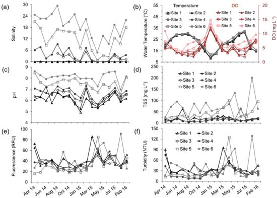 Temporal trends of salinity (a), water temperature (b), dissolved oxygen (DO) concentration (b), pH (c), total suspended solids (TSS) (d), fluorescence (e), and turbidity (f) at six sampling sites along the Calcasieu River from April 2014 to February 2016.