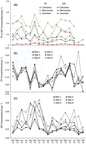 Concentrations of TP and DIP in the Calcasieu, Mermentau, and Vermilion Rivers from April 2014 to February 2016; The Mermentau and Vermilion Rivers were only sampled from April 2014 to July 2015; Data for the Calcasieu, Mermentau, and Vermilion Rivers in (a) are data for sites 1, 7, and 8; (b) TP concentration in the Calcasieu River; (c) DIP concentration in the Calcasieu River.