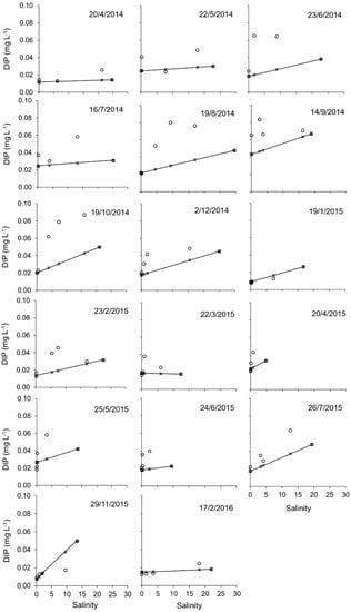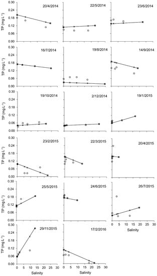 In this study, we found no clear mixing dynamics of total phosphorus (Figure 5). The average TP concentrations at the six sites from upstream to downstream were fairly consistent. The mixing dynamics of DIP concentration versus salinity plots suggest a source was present throughout the Calcasieu Estuary since measured DIP concentration was usually higher than those predicted by conservative mixing (Figure 6), and this source is not related to seasonal change. The ultimate source of biologically available DIP is the weathering of continental rocks. However, only about 5% to 10% of the phosphorus eroded from continental rocks is thought to be carried to the oceans in dissolved form, and the rest is presumably carried as inert phosphorus in fluvial detrital grains [,]. Therefore, the forms of phosphorus have important impact on phosphorus transport and transformation dynamics in a river system.