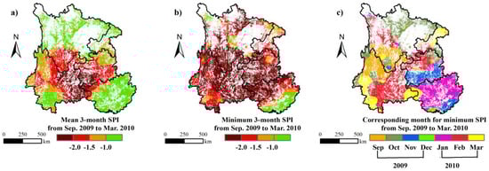 The area and extent of droughts in 2009 and 2010 based on 3-month standard precipitation index (SPI) from September 2009 to March 2010. (a) The mean 3-month SPI from September 2009 to March 2010; (b) minimum 3-month SPI from September 2009 to March 2010, which calculated by the minimum SPI during drought period based on pixel by pixel; (c) the corresponding month for minimum SPI during the drought period.