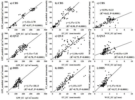 The validation of modeled monthly gross primary productivity (GPP), evapotranspiration (ET) and water-use efficiency (WUE) with eddy covariance flux data for three forest sites in China. CBS (a–c), Changbaishan temperate broad-leaved Korean pine mixed forest; QYZ (d–f), Qianyanzhou subtropical coniferous plantation: DHS (g–i), Dinghushan subtropical evergreen broad-leaved forest. All monthly data were from 2003–2010, except for DHS (2003–2009).