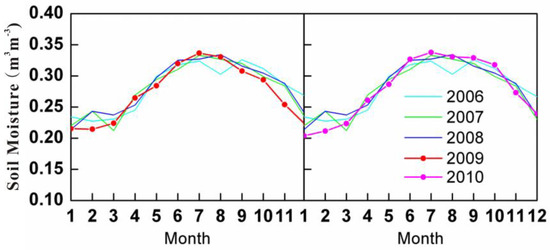 The inner-annual variation of soil moisture derived from microwave information during 2006–2010 in south-western China. The soil moisture in two drought years was separately compared to the baseline conditions (2006–2008).