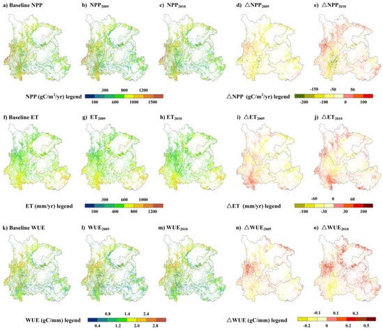 The spatial distribution for (a) baseline NPP; (b) NPP2009; (c) NPP2010; (d) △NPP2009 = NPP2009-baseline NPP; (e) △NPP2010 = NPP2010-baseline NPP; (f) baseline ET; (g) ET2009; (h) ET2010; (i) △ET2009 = ET2009-baseline ET; (j) △ET2010 = ET2010-baseline ET; (k) baseline WUE; (l) WUE2009; (m) WUE2010; (n) △WUE2009 = WUE2009-baseline WUE; (o) △WUE2010 = WUE2010-baseline WUE.