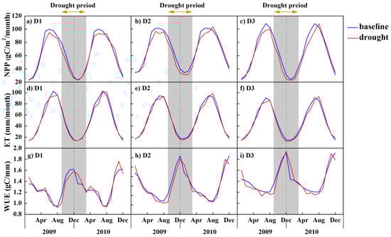 The time series of NPP (a–c), ET (d–f), and WUE (g–i) under the normal condition and drought condition extracted by drought class. Drought class: D1: Moderate drought; D2: Severe drought; D3: Extreme drought.