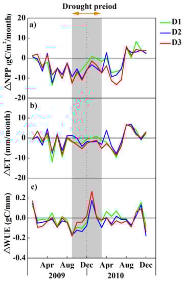 The time series of the difference between ecosystem measures under the drought condition (2009 and 2010) and normal condition. (a) △NPP = NPP2009 or 2010-baseline NPP in each drought class region; (b) △ET = ET2009 or 2010-baseline ET in each drought class region; (c) △WUE = WUE2009 or 2010-baseline WUE in each drought class region. Drought class: D1: Moderate drought; D2: Severe drought; D3: Extreme drought.