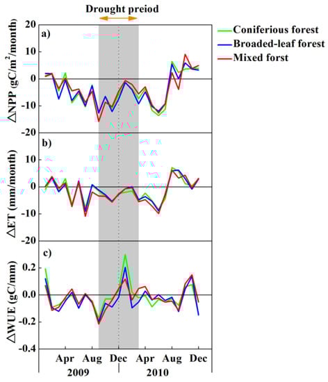The time series of the difference between ecosystem measures under the drought condition (2009 and 2010) and normal condition in extreme drought (SPI < −2.0) for three vegetation types (coniferous forest, broadleaf forest, and mixed forest). (a) △NPP = NPP2009 or 2010-baseline NPP in D3 (extreme drought); (b) △ET = ET2009 or 2010-baseline ET in D3 (extreme drought); (c) △WUE = WUE2009 or 2010-baseline WUE in D3 (extreme drought).