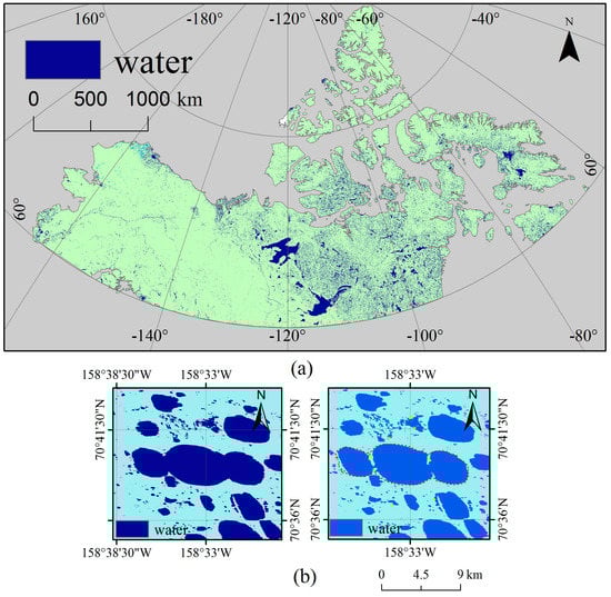 Lately, there are some water products [] using Landsat imagery whose temporal resolution achieved a yearly, even monthly level. Global Surface Water v1.0 [] shows a series of maps of global inland water from 1984 to 2015 at a monthly resolution. Moreover, Pekel [] concentrated on global scale analysis and did not analyze the dynamics of the Arctic open water and often overestimated the water (Figure 1). However, the hydrological process and the role of a factor may differ by location, particularly in the Arctic [], where the special climate and high latitude make the Arctic region unique. So it is important to investigate the pattern of inland water dynamics in the Arctic on a regional scale and at high temporal resolution.