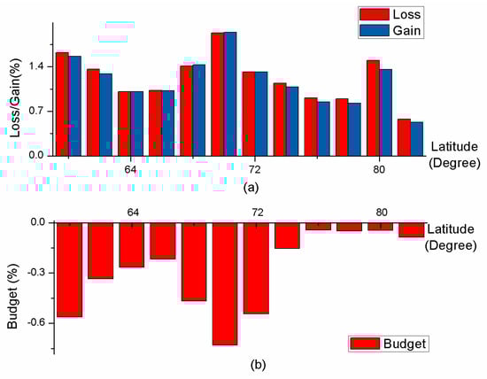 From Figure 6, the loss and gain areas rise abruptly at 70° N, where the coastal zone dominates, possibly due to the shrinking sea ice []. The shrinking sea ice results in higher temperatures and increased snowfall, which decreases the lake ice thickness. The budget dynamics of latitude shows a different pattern. The budget at 68° N begins to change abruptly and decreases as the latitude increases from 60° N to 68° N. The region above 68° N shows the same trend.