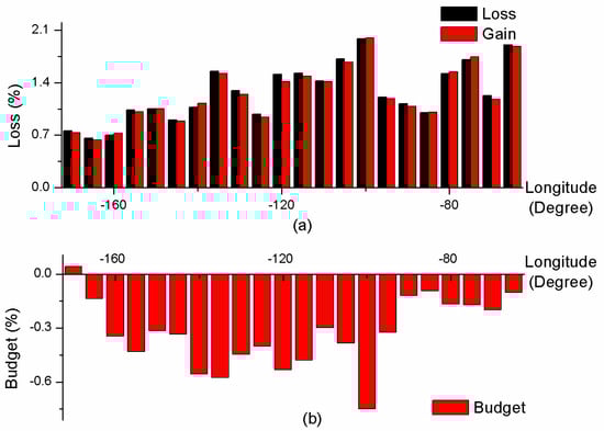 The dynamics of inland water according to the longitude (the figure shows the yearly average water dynamics with longitude), the Figures (a) and (b) respectively repercent changing percentage of loss/gain and budget over the longitude.