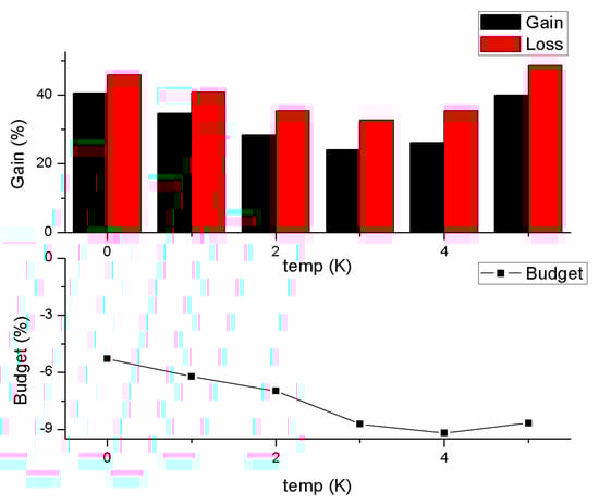 Permafrost thaw is related to the surface temperature. A different process of thaw occurs at different temperatures and, consequently, water will change at various levels. The paper uses the MODIS LST/Emissivity products, MYD11A2 and MOD11A2 [,], to analyze the water dynamics with annual average temperature differences (Figure 9). As observed in Figure 9, the paper found that the loss and gain of water showed the same trend. In the beginning, the loss and gain areas declined and then the loss and gain areas increased with the rising temperatures. However, this trend cannot be explained by temperature alone, as there are other factors (for example, Lake ice, wind, and morphological variables) involved in the process []. The budget shows a different trend—as the temperatures rise, the net loss increases at first and then decreases. This trend is consistent with the water response to permafrost thaw [].