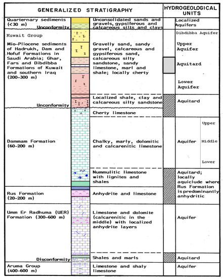 Figure 2). The entire hydrologic system in Kuwait is bounded on the top by the water table of the Kg aquifer, and on the base by the relatively impermeable nummulitic limestone with lignites and shale intercalations of the Dammam Formation, along with the underlying massive anhydrides (20–200 m) of the Rus Formation (Lower Eocene).