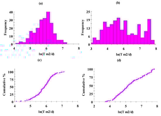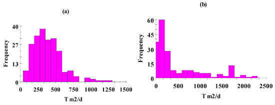 Figure 4a,b), as indicated by the values of the coefficient of skewness. The two histograms indicate marked asymmetry, especially the Dm aquifer, with tails towards the higher values of transmissivity, suggesting log-normal distribution. This behavior for transmissivity histograms appears to be consistent with those observed in geostatistical transmissivity studies elsewhere [