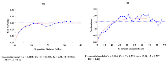Figure 10a,b. These values were the highest values obtained among the examined models and the lag distances. Accordingly, the exponential model was selected based on the criteria and the difference between the actual and estimated values (