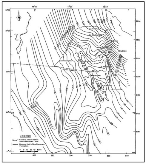 Figure 2), the entire sequence is considered as one hydrographic unit for the aquifer development. The saturated thickness of the aquifer ranges from zero at the southwestern corner of Kuwait, where the aquifer is dry, to over 300 m to the northeast. This general trend in the saturated thickness is interrupted by localized reductions in the coastal areas of the anticlines, and in some areas, complete desaturation (structures at southeast and east of Kuwait). The potentiometric surface of the Kg aquifer follows closely that of the Dm aquifer, and hence, its flow direction. However, the potentiometric values in the former are lower by about 5 m, with head differences increasing towards the coastal area. The Kg aquifer contains water similar in quality to that of the Dm aquifer [