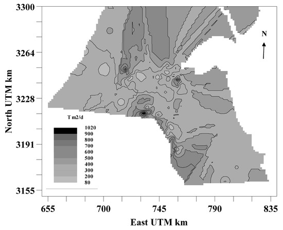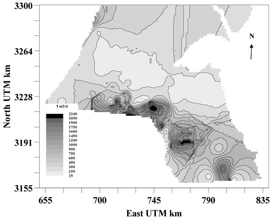A spatial map has been generated from the T values obtained by geostatistical techniques for Kg and Dm aquifers (