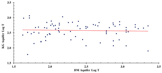 Figure 3). The T obtained from kriging for the two aquifers has a certain degree of correlation. Co-kriging was the next logical step in this geostatistical analysis, with the aim that T of Kg aquifer could be better estimated using the widespread Dm aquifer T. There were 78 identical locations that were tested. The T values for these were not correlated, and the correlation coefficient was 0.047 (