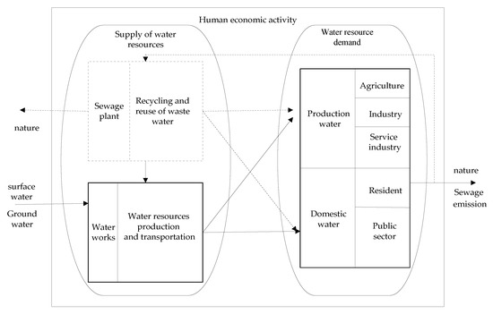Definitions of water use efficiency are far from uniform because of different research objectives, research needs, data characteristics, and model methods. For instance, the Alberta Water Council [39] defines water use efficiency as “the index of the relationship between the amount of water needed for a particular job and the amount of water used or appropriated”. It is noteworthy that the roles of water resources differ in different departments; thus, the definition of water resource efficiency also differs. Figure 1 describes the circulation of water resources in human economic life [18].