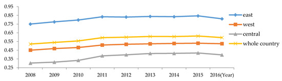 Figure 2 illustrates the entire country’s mean water use efficiencies, and the three areas for each year, from 2008–2016. This figure allows for us to safely conclude that from an area perspective, the eastern region has the highest average efficiency, while the central region has the lowest average efficiency. Furthermore, we know that the eastern area’s average water use efficiency is higher than the entire country’s in each year in the sample period.