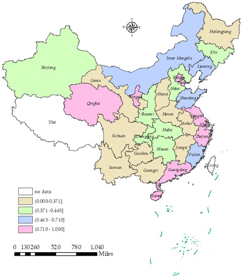 Based on the basic principle of spatial differentiation, the water resource efficiency of 30 provinces, autonomous regions, and municipalities directly under the central government of China is divided into four categories while using the natural breakpoint method. Then, we analyzed the spatial distribution pattern.
