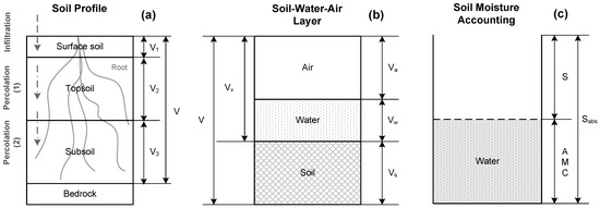Each soil layer in the soil profile is classified among solids, water, and air, as shown in Figure 1b. In this figure, soil indicates the total volume of the soil particles, including its minerals and organics. The pore space of soil contains the liquid and gas phases of soil, i.e., everything but the solid phase that contains mainly minerals of varying sizes as well as organic compounds. Water means that the total water amount currently stored in the soil pore space, and represents AMC from previous precipitation [32]. Air can be part of the void space when not saturated with water. The volume of void space is determined by a degree of soil saturation under the assumption the total pore space volume of the soil column is constant. So, the void space is equal to the current potential maximum moisture retention. The sum of air and water are the absolute potential maximum moisture retention (Sabs) [14]. The total volume of voids and the absolute potential maximum moisture retention are theoretically equal, as shown by Equation (7).