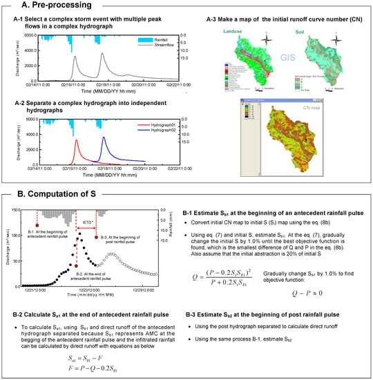 (c) To estimate an event-based CN, an initial 1 km by 1 km CN map based on the land-use and soil maps was used (A-3 in pre-processing in Figure 2). To determine the appropriate event-based CN for each rainfall pulse, CN values in the CN map were changed uniformly and incrementally by 1.0% until a volume of simulated runoff flows by CN method matches a volume of the observed runoff flows. Areal average CN from the best appropriate event-based CN map was then used to calculate S as the representative value for the event. In addition, it should be emphasized that the initial abstraction is important to estimate CN values as it is related to the capacity of soil moisture retention. In this study for a developing purpose, it is assumed to be 20%. However, many studies have suggested various initial abstractions depending on region [6,23,42,43].