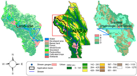 The Napa River basin in Napa County, CA, was used as an application watershed. The gage at St. Helena (USGS 11456000), Napa County, CA, was the primary site to collect hydrographs as it is located in the upper portion of the basin and has minimal water management influences. Figure 3 shows the location of the Napa watershed and the land-use and the soil maps. The drainage area is 204.8 km2 (79.3 mi2). Annual average precipitation is 685 mm, of which 80% occurs mainly during the rainy season from November to March.
