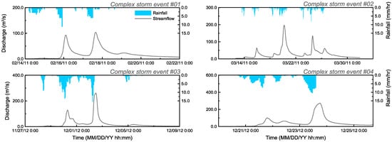 Rainfall hyetographs and hydrographs of the four complex storm events addressed in this study.