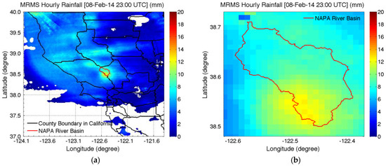 It is possible to estimate the CN value of each grid of the rainfall field since MRMS is a radar-based gridded rainfall product. Moreover, based on Willie et al. [45], the MRMS QPE was generated using the Vertical-Profile-of-Reflectivity (VPR) and the Mean Field Bias (MFB) correction method [46,47]. Figure 5 shows (a) a sample MRMS hourly rainfall map in Northern California and (b) the same sample MRMS hourly rainfall map for the application basin.