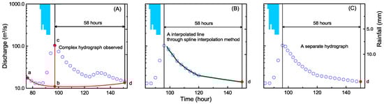 Figure 6 shows the process to separate a multiple peak hydrograph into its pulse components, described as follows: (1) Estimate the duration from a time to peak to the end time of runoff using the N-day method, as shown in Figure 6A. (2) Use the spline interpolation method to estimate the pulse discharges on the regression limb, as shown in Figure 6B. When applying the interpolation method, this study used the discharges for the recession limb and the end time of runoff flow from the N-day method. Finally, the separated hydrograph is shown in Figure 6C. A similar process is done for the remaining peaks.