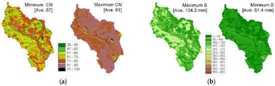 In Figure 7b, S and CN are inversely proportional, so the maximum S is from the minimum CN value. The maximum S is twice the minimum S, because the CN-S relationship is non-linear (Equation (6)). Areal mean S using minimum CN is 134.3 mm and the areal mean S using maximum CN is 61.4 mm. These S values indicate the amount of SMC the soil column could hold at any time.