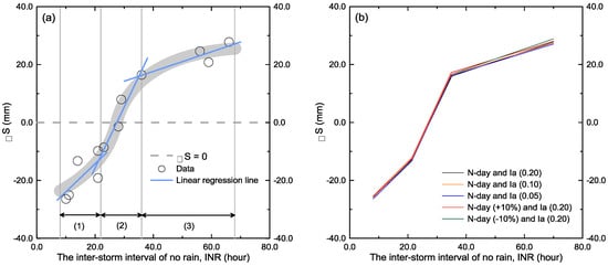 (e) The INR between two rainfall pulses was used as the time interval to recover S. In this study, the interval was assumed as the time period enabling S to recover through the downward movement of soil moisture and evapotranspiration. The INR was calculated while considering the time duration from the end of antecedent rainfall pulse to the beginning of the post rainfall pulse (Figure 2).