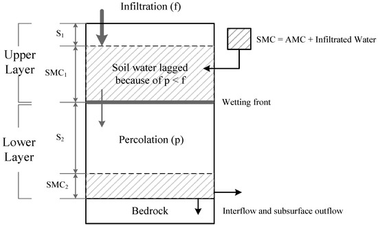 Conceptual diagram of a soil column considering the soil layers in the first section: This study assumed that the soil column consists of two layers, an upper layer (saturated by infiltration) and a lower layer (saturated by percolation). S indicates the soil moisture retention (SMR) and SMC means Soil Water Content consisting of antecedent moisture content (AMC) and the infiltrated water. The wetting front based on Green and Ampt [49] represents the boundary between two layers causing the retardation effect by the difference of infiltration and percolation rates.