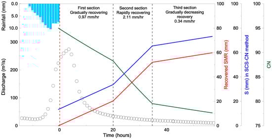 Figure 11 shows the derived R-curve consisting of three sections with a hydrograph for event No. 16. The R-curve, recovered SMR, and CN curves are plotted on the hydrograph to show a potential application instance for flood forecasting. The first section for low INR periods is characterized by gradually recovering SMR values. For the Napa River watershed, the time period of this section is 0–21 h with 0.97 mm/h (23.28 mm/day). In this section, surface water is being infiltrated into soil, so the rate is slower than for the second section. Also, downward percolation is a primary contributor to the recovery of SMR in a short-term (Figure 12a).
