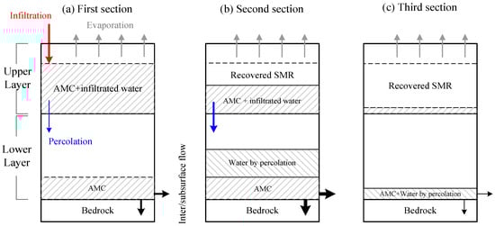 According to Thomas et al. [50], there is a gap between the infiltration rate (92–267 mm/day) and the percolation rate (40–109 mm/day). If percolation is slower than the infiltration rate, a retardation boundary between two layers occurs because water is not readily flowing to the lower layer, as shown in Figure 9. The boundary could be described as the wetting front. Thus, when the upper layer is saturated and there is the retardation effect, it appears as if the total SMR is decreased without additional rainfall during the INR, even though the actual total SMR is increased by the drainage.