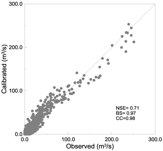 The ModClark method requires two parameter inputs, time of concentration (Tc) defined as a time needed for runoff flow from the most remote location to the outlet in a watershed and storage coefficient (K) defined as a lag time due to storage effects. Using independent storm events in Table 2, the parameters are estimated. This study employs the HEC-HMS optimization tools [65] to estimate the proper parameters for each storm event. Table 4 shows the estimated parameters with error indices (peak flow, total runoff flow, correlation coefficient (CC), bias (BS), and Nash-Sutcliffe efficiency coefficient (NSE)). Except for two events (1 and 4), all of peak flow error (%) and total runoff flow error (%) were under 25%. The mean error values of peak flow, total runoff flow, and time to peak are 6.4%, −0.2%, and −0.1 h, respectively. CC, BS, and NSE, also, confirm that the simulation results using the estimated parameters are acceptable. For the application instance, the mean values from the estimated parameters are used as the representative parameters (Tc = 8.5 h and K = 6.5 h). Figure 13 shows a scatterplot of the observed runoff flows and the calibrated runoff flows using the representative parameters. The data are for the same sixteen storm events in Table 4. The error indices, NSE, BS, and CC, showed similar results, as above.
