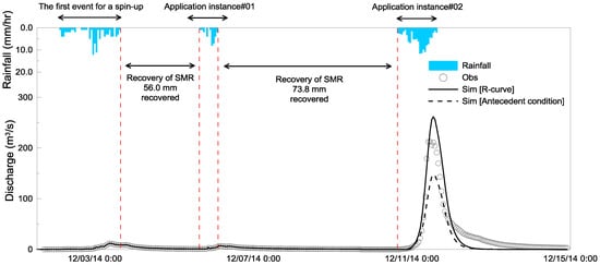 In the application example, a different complex storm event was simulated, which was not used in the derivation of the R-curve and the estimation of the model parameters. The complex storm event occurred from 01-December-2014 to 11-December-2014. During the period, three independent rainfall events generated three corresponding streamflow responses. The first event is used as a spin-up period and as a starting point of estimating direct runoff using the R-curve. The MRMS data was used as the gridded rainfall data. An hourly time step was chosen as the temporal resolution of the model simulation. To apply the R-curve, a period for the model spin-up was needed. This process is common in continuous hydrologic models to set up initial conditions. During this spin-up period, a CN value was the initial condition for the soil moisture state, and the R-curve can start to estimate soil moisture retention with S values at the end of the spin-up period. In this application instance, the spin-up period encompasses the rainfall event from 01-December-2014 to 03-December-2014, and the two rainfall events on 06-December-2014 and 11-December-2014 were used to verify the R-curve performance with the hydrologic model.