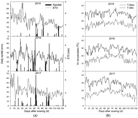 (a) Daily rainfall and reference evapotranspiration (ETo) during the study period in 2015, 2016, and 2017; and, (b) Daily temperature during the study period in 2015, 2016, and 2017.