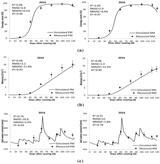 Calibration results showing comparisons between the simulated and measured (a) canopy cover; (b) biomass accumlation; and, (c) soil water content of foxtail millet for plastic film mulching (PM)-left, and no mulching (NM)-right, treatments in 2016 crop season.