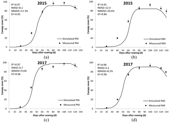 The calibration results indicated that the model was generally able to simulate CC development very well for both PM and NM in 2016 (Figure 2). Although slight underestimations of CC were demonstrated in the early and late growth seasons, strong agreement was exhibited between the measured and simulated data for both PM and NM, as indicated by R2 ranging from 0.98 to 0.99, EF ranging from 0.96 to 0.97, RMSE ranging from 5.9 to 6.8, and NRMSE ranging from 8.9% to 9.5%, respectively. Besides, the results of NM were observed to have lower RMSE and NRMSE and higher EF when compared with the results of PM.