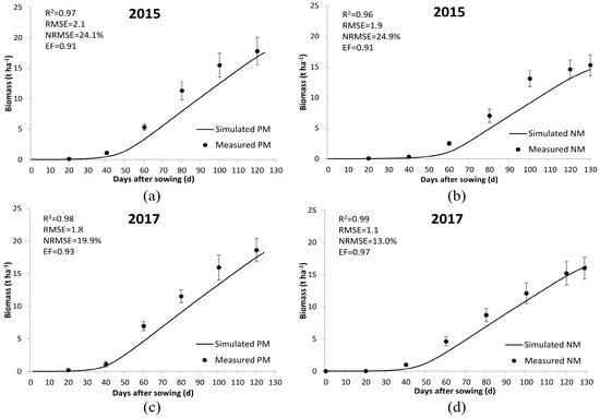 Figure 2 and Table 4 reveal that the model accurately simulated the aboveground biomass accumulation for both PM and NM, with a low RMSE and NRMSE, a high R2 and EF, and small deviations ranging from 1.1% to −2.8%. However, the model tended to underestimate the biomass accumulation in the middle of the growth season. NM also had a more favorable simulation performance when compared with PM based on these statistical values.
