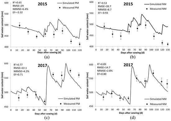 Validation results showing comparisons between simulated and measured soil water content for plastic film mulching (PM)-left, and no mulching (NM)-right, in 2015 and 2017 crop season. (a) PM treatment in 2015 (b) NM treatment in 2015 (c) PM treatment in 2017 (d) NM treatment in 2017.
