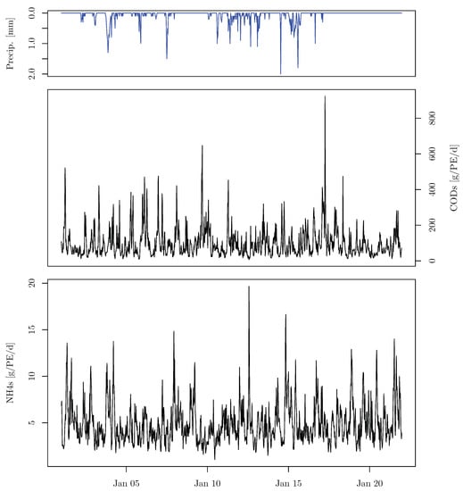 where refers to dry weather flow and to rainwater. , and are vectors of length equal to the input precipitation time series, . can be a vector of length equal to or a unique value constant in time. Two indicators of water pollution are simulated: COD and NH. Table 1 presents the main components and input variables of the EmiStatR model. The main model outputs are listed in Table 2.