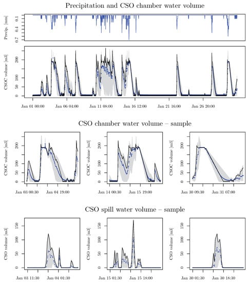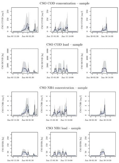 The example is an application in temporal UP for simulation of the water volume and water quality dynamics in combined sewer systems (CSSs). CSSs are designed to convey wastewater during precipitation events and also directly to the wastewater treatment facility in dry weather flow conditions. In CSSs, two types of discharge are distinguished: (1) the pass forward flow, which transports the sewage discharge directly to the wastewater treatment facility [29]; (2) the combined sewer overflow (CSO), which is the sewage diverted from the treatment facility and discharged, untreated, into a local receiving water body during heavy precipitation events [30]. CSOs, when released to the environment, can have an important damaging impact on the water quality status of receiving waters (streams, rivers, ponds, lakes, wetlands, and oceans). About 50% of pollutants in stormwater are metals, nutrients, organic toxins, and bacteria, and are associated with particulate matter. The other 50% are soluble [30], and therefore these pollutants can be more persistent in the water and the environment itself. Minimisation of the CSO spill volume is therefore important for the preservation of good water quality status of receiving waters. The goal of this example is to quantify model output uncertainty when model input uncertainties are propagated through a simplified lumped urban drainage model.